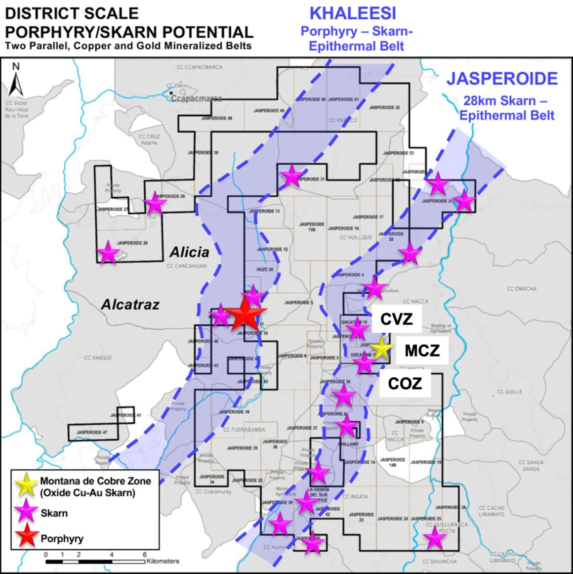 C3 Metals ha identificado 13 objetivos de skarn a lo largo del cinturón Jasperoide en el lado este de su propiedad y múltiples skarns y un objetivo de pórfido aflorante en el cinturón Khaleesi en el lado occidental de su propiedad (Figura 2). Desde que adquirió su paquete inicial de 5.700 concesiones minerales en 2020, C3 Metals ha ampliado su huella de concesiones minerales en un 426% a aproximadamente 30.000 hectáreas. La Compañía considera que este paquete es altamente estratégico dado su potencial geológico y su proximidad a múltiples minas operativas.