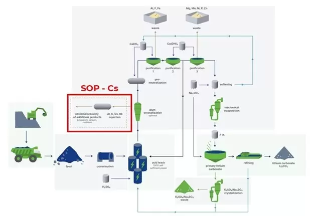 La mineralización de litio de estilo volcánico de Falchani, con impurezas naturalmente bajas, admite un diagrama de flujo sencillo que produce carbonato de litio de alta pureza (>99,5%), que cumple con las especificaciones de grado de batería. La mineralización de Falchani está enriquecida en cesio, potasio y rubidio junto con litio. Los resultados de los trabajos de prueba recientes demuestran la producción de un producto de sulfato de cesio mixto vendible (~ 18% Cs) y sulfato de potasa de alta calidad («SOP»), con fuertes recuperaciones a bajo costo adicional. Se planea un trabajo adicional para aumentar el contenido de cesio del subproducto de sulfato por encima del 18% de Cs.