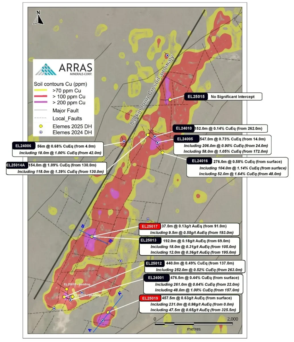 Arras Minerals Corp. (TSXV: ARK) (OTCQB: ARRKF) («Arras» o «Arras Minerals» o «la Compañía») se complace en anunciar los resultados de perforación del Objetivo Este Berezski en el Proyecto Elemes. El pozo EL25019 entregó amplias zonas de mineralización de oro y cobre de alta ley comenzando en la superficie. Este pozo subraya el potencial de escala que se está desarrollando en el área Berezski Central – Berezski East del Proyecto Elemes.