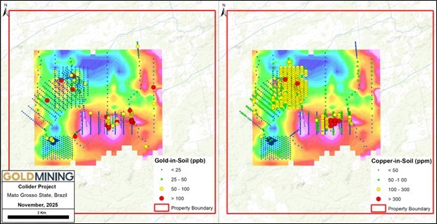 Figura 2 – Proyecto Colíder, oro en el suelo (izquierda) y cobre en el suelo (derecha), magnéticos suprayacentes. (Grupo CNW/GoldMining Inc.)