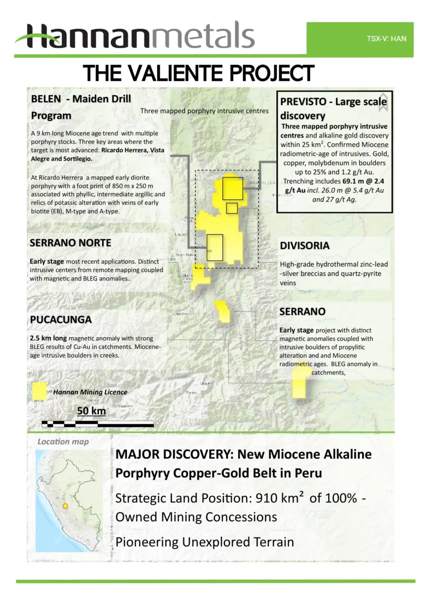Durante 2021, Hannan apostó y aún mantiene 910 km2 de concesiones mineras 100% propias en Valiente que cubren terreno inexplorado para posibles objetivos de pórfido mineralizado en el centro este de Perú. El Proyecto Valiente ha evolucionado rápidamente de un prospecto greenfields a una oportunidad de prospectos múltiples.
