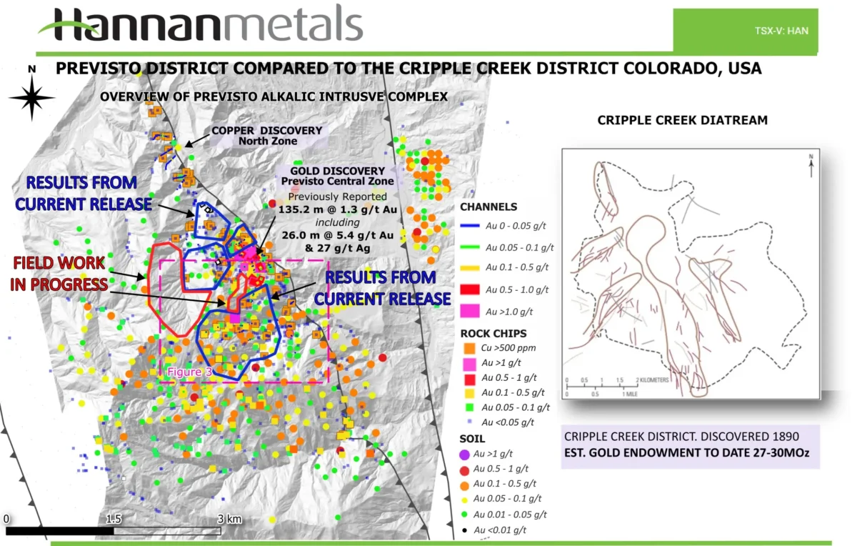 Figura 2: Mapa que muestra la vasta anomalía de oro de 5×5 km en Previsto y la ubicación de los resultados actuales, en comparación con el distrito aurífero de Cripple Creek.