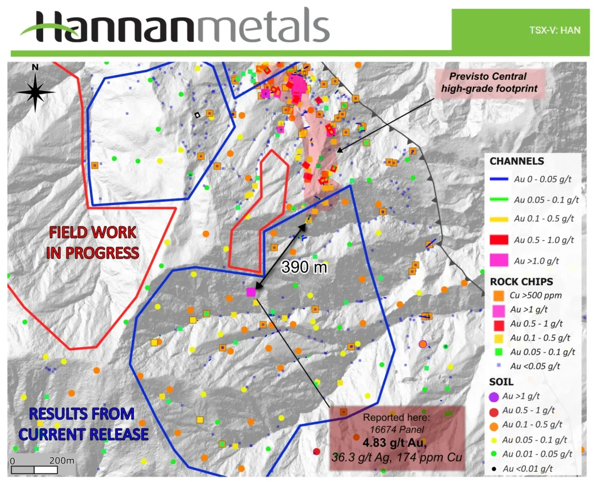 1. Identificación de más oro de alta ley: El muestreo de astillas de roca arrojó hasta 4.8 g/t Au con 36.3 g/t Ag de rocas hospedadoras metasedimentarias, ubicadas a 390 m al suroeste de la huella de alta ley existente de Previsto Central, lo que indica potencial de extensión o una nueva tendencia mineralizada paralela.