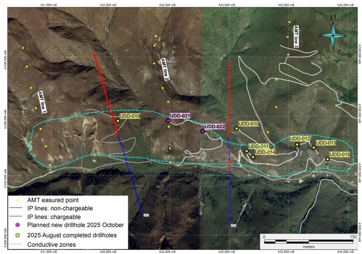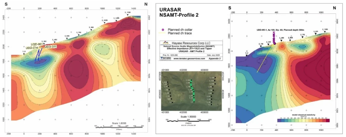 En julio de 2025, se completó un estudio geofísico audio-magnetotelúrico (AMT) de prueba que comprende tres líneas de estudio en Urasar justo cuando concluía el programa de perforación de verano. Como se ve en el modelo de resistividad a continuación, las zonas de baja resistividad / alta conductividad parecen corresponder a áreas de mineralización de sulfuro intersectadas en pozos de perforación UDD-01, UDD-11 y UDD-14. Los datos también sugieren que estos pozos pueden haber terminado prematuramente, particularmente el pozo UDD-01, que se perdió a 146 m justo cuando entró en una zona de mineralización prometedora de calcopirita de cuarzo.