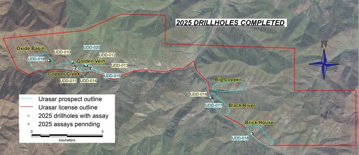 El distrito mineral de Urasar, de 15 kilómetros de largo, está situado a lo largo de una importante sutura de la corteza que marca el cierre del antiguo mar de Tetyan. El distrito se caracteriza por una alteración argílica de fuerte a intensa a avanzada, así como por una mineralización de sulfuro superficial en toda su longitud. La parte occidental de la licencia presenta mineralización de cobre-oro alojada en brechas, mientras que la zona central está dominada por cuerpos de sulfuro masivos que contienen oro y cobre. El extremo oriental del distrito exhibe mineralización de metales base y oro anómalo en la superficie. Urasar fue explotado por primera vez por los franceses en 1914, seguido de programas de exploración soviéticos en las décadas de 1930 y 1956-1960, que comprendían más de 20 pozos de exploración y al menos 15 pozos de perforación poco profundos.