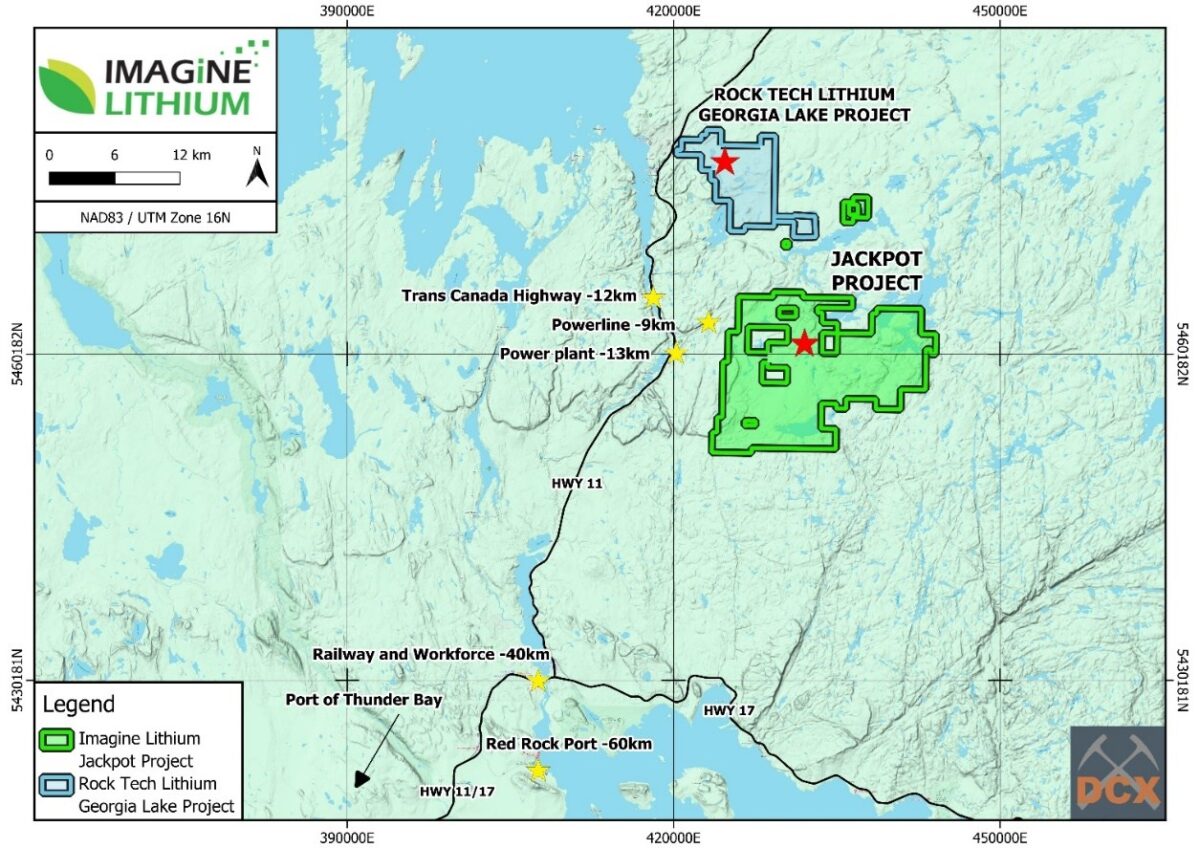 Imagine es una empresa junior de exploración minera enfocada en buscar y adquirir proyectos minerales de clase mundial. La compañía posee la propiedad de litio Jackpot ubicada en el área del lago Georgia, a unos 140 km al NNE de Thunder Bay, Ontario, está aproximadamente a 12 km por carretera de la autopista Trans-Canada (Hwy 11) y está cerca de fuentes de energía, ferrocarriles y puertos. La propiedad de Jackpot consta de 297 reclamos minerales que cubren 18,800 hectáreas. La propiedad contiene recursos minerales que cumplen con NI 43-101 de 3.1 Mt con una ley de 0.85% de Li2O en la categoría Indicada y 5,3 Mt con una ley de 0,91% Li2O en la categoría Inferida, así como una serie de otras muestras de pegmatita conocidas.