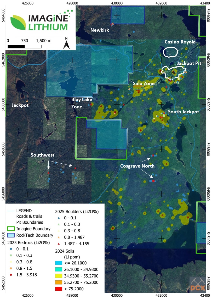 De las seis nuevas zonas mineralizadas de espodumena, Jackpot West y Cosgrave North tienen pegmatita de litio in situ en la superficie (Figura 3). Las zonas de Jackpot South y Newkirk consisten en subcultivos y rocas, mientras que la zona suroeste y la zona de Blay Lake están definidas por rocas (Figura 3). Las zonas de Jackpot South, Blay Lake, Jackpot West, Cosgrave North y Newkirk estarán permitidas para la perforación diamantina y el desmonte del lecho rocoso que se completará en el invierno y la primavera de 2026.