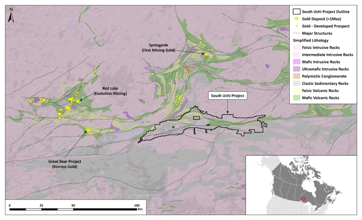 El Proyecto South Uchi fue identificado y apostado por primera vez por Kenorland en función de la prospectividad de la región poco explorada para albergar importantes sistemas mineralizados de oro. El proyecto cubre una parte de las rocas volcánicas del Ensamblaje de la Confederación, así como el límite entre la subprovincia geológica de Uchi al norte y la subprovincia geológica del Río Inglés al sur. Múltiples zonas importantes de deformación de rumbo este-oeste asociadas con el límite de la subprovincia atraviesan el Proyecto, lo que resulta en zonas de fuerte cizallamiento y plegamiento de la estratigrafía supracortical, que son configuraciones favorables para la mineralización de oro orogénica. Antes de que Kenorland replanteara el Proyecto, los registros indicaban que se había completado poca o ninguna exploración sistemática, y el paquete de tierras seguía sin explorarse. La mayoría de los depósitos de oro en el Distrito del Lago Rojo (Lago Rojo, Madsen, Hasaga y otros) se encuentran en el margen norte del Conjunto de la Confederación. Sin embargo, descubrimientos recientes como la zona de falla LP en el Proyecto Dixie por Great Bear Resources Ltd. (adquirida por Kinross Gold y rebautizada como Proyecto Great Bear) destacan la prospectividad de todo el Conjunto de la Confederación a lo largo del margen sur de la subprovincia de Uchi.