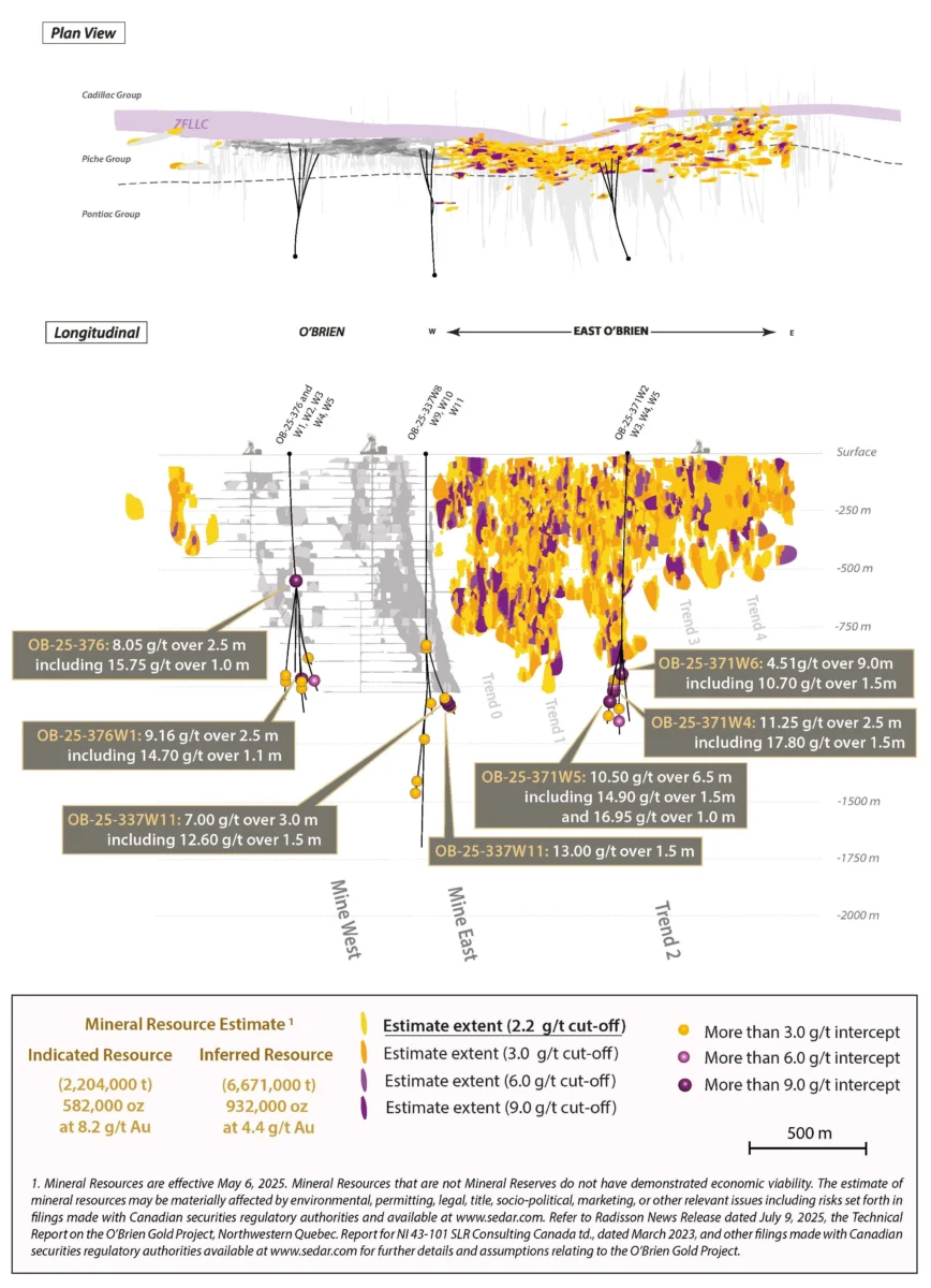 Radisson es una compañía de exploración de oro enfocada en su Proyecto de Oro O’Brien de propiedad al 100%, ubicado en el campamento minero Bousquet-Cadillac a lo largo de la mundialmente famosa Larder-Lake-Cadillac Break en Abitibi, Quebec. Una evaluación económica preliminar de julio de 2025 describió un proyecto de bajo costo y alto valor con una vida útil de la mina de 11 años y un potencial de crecimiento significativo basado en el uso de la infraestructura regional existente. Los Recursos Minerales Indicados se estiman en 0,58 millones de onzas (2,20 millones de toneladas a 8,2 g/t Au), con Recursos Minerales Inferidos adicionales estimados en 0,93 millones de onzas (6,67 millones de toneladas a 4,4 g/t Au). Consulte el NI 43-101 «Informe técnico y evaluación económica preliminar del proyecto de oro O’Brien, Quebec, Canadá» vigente a partir del 27 de junio de 2025 y otras presentaciones realizadas ante las autoridades reguladoras de valores canadienses disponibles en www.sedarplus.ca para obtener más detalles y suposiciones relacionadas con el Proyecto de oro O’Brien.