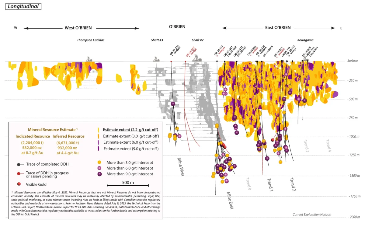 Desde finales de 2024, Radisson ha estado llevando a cabo un programa de amplias salidas debajo de la histórica mina de oro O’Brien y los recursos minerales existentes diseñados para probar el alcance de la mineralización en el Proyecto. Esta perforación se logra con orificios piloto seguidos de cuñas y perforación direccional para maximizar la eficiencia de la perforación. El 16 de octubre de 2025, Radisson anunció la expansión del programa de perforación escalonada a 140,000 metros empleando un eventual ocho equipos de perforación.