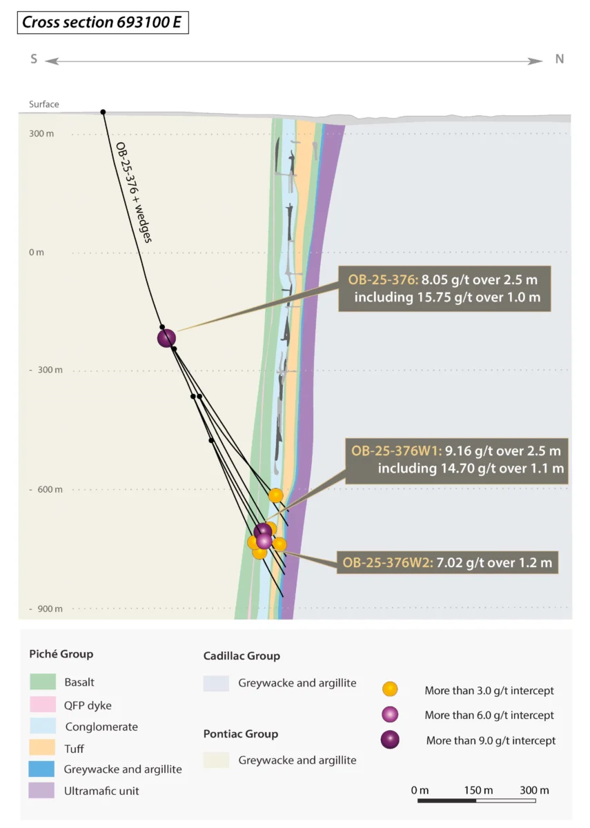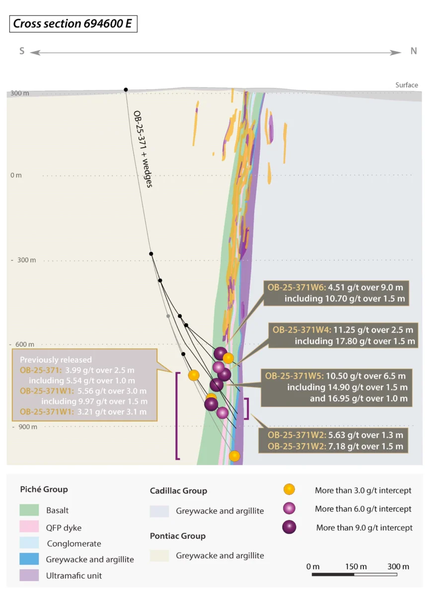 - OB-25-371W5 interceptó 10,50 gramos por tonelada («g/t») de oro («Au») en 6,5 metros, incluidos 14,90 g/t Au en 1,5 metros e incluyendo 16,95 g/t Au en 1,0 metro