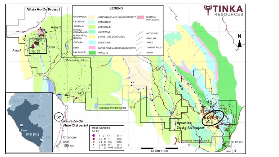 Figura 1. Mapa geológico regional de los proyectos Silvia y Ayawilca de Tinka con muestreo de superficie de cobre y viviendas