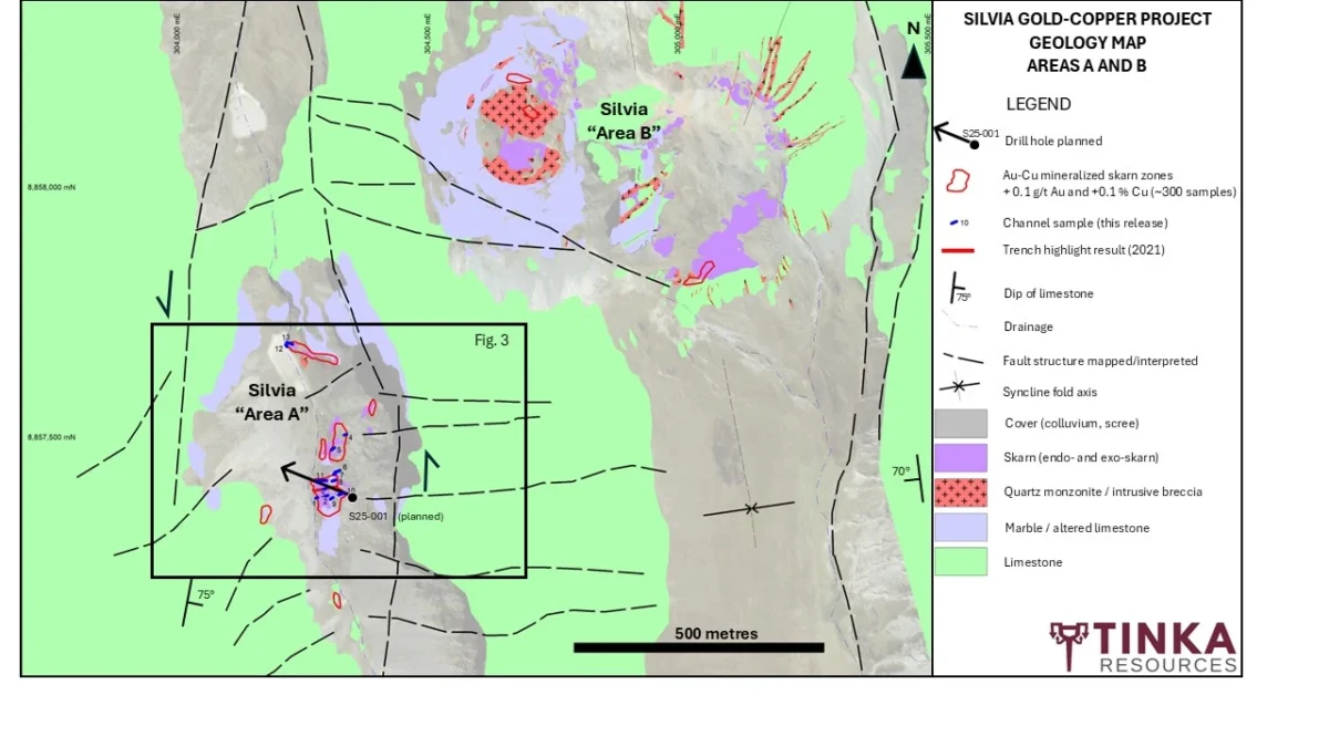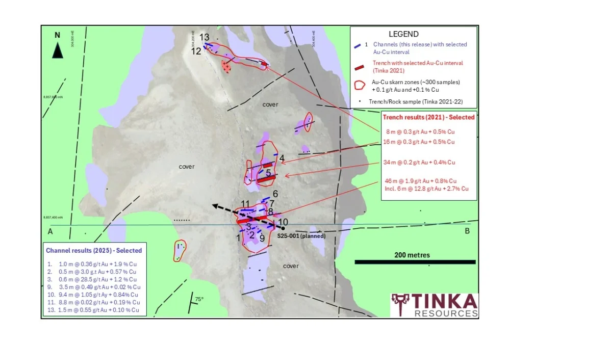 En septiembre de 2025, una empresa minera de terceros llevó a cabo un programa de muestreo de validación limitado de la mineralización de oro y cobre en los skarns de las Áreas A y B, y estos resultados se han puesto a disposición de Tinka. Las muestras se recolectaron a lo largo de canales continuos o canales de astillas en varios lugares del Área A, con cada canal entre 0,5 y 9,4 m de longitud. El tercero no tomó muestras de todos los anchos de las trincheras de Tinka anteriores, sino que optó por muestrear intervalos más estrechos en diferentes partes de los mismos afloramientos. Cada canal estaba representado por hasta cinco muestras individuales con cada muestra de entre 0,3 y 3,0 m de longitud. En el Cuadro 1 se resumen los resultados completos de los canales continuos, que se representan en las Figuras 2 y 3.