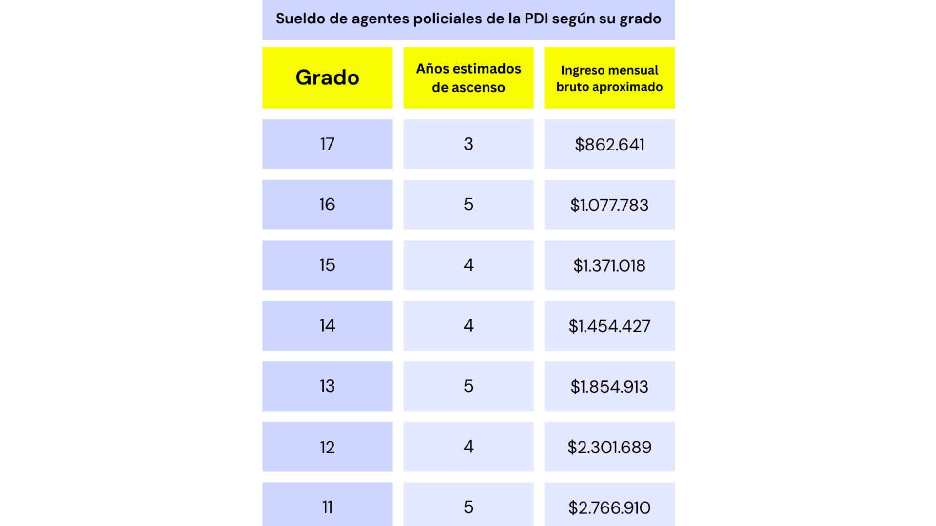 En cuanto a la paga, el ingreso mensual bruto aproximado parte en los $862.641 y puede escalar hasta los $2.766.910 en un estimado de cinco años de ascenso. El detalle de los sueldos según el grado del agente policial se encuentra más adelante en la nota.