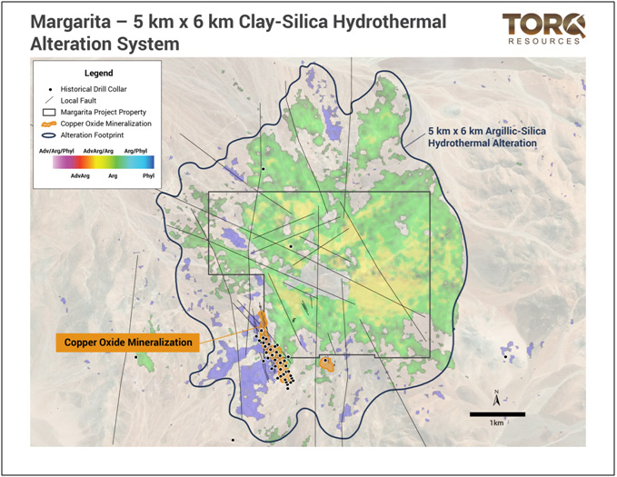 Figura 2: Ilustra el sistema de alteración arcilla-sílice a gran escala que se centra en la propiedad Margarita y la posición de la mineralización de óxido de cobre en la esquina suroeste del área del proyecto.