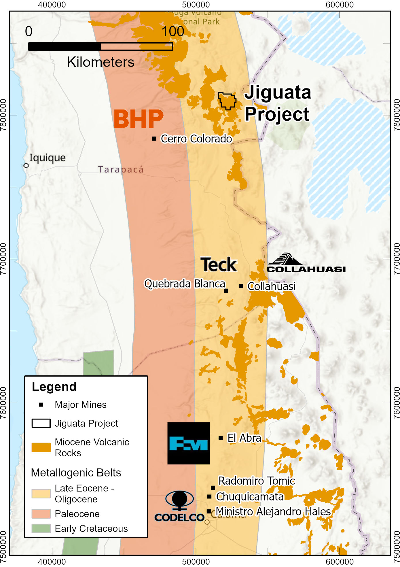 Figura 1. Ubicación de la Propiedad Jiguata dentro de la extensión norte del Cinturón Metalogénico Eoceno-Oligoceno del norte de Chile, que alberga varios de los mayores yacimientos de cobre del mundo.