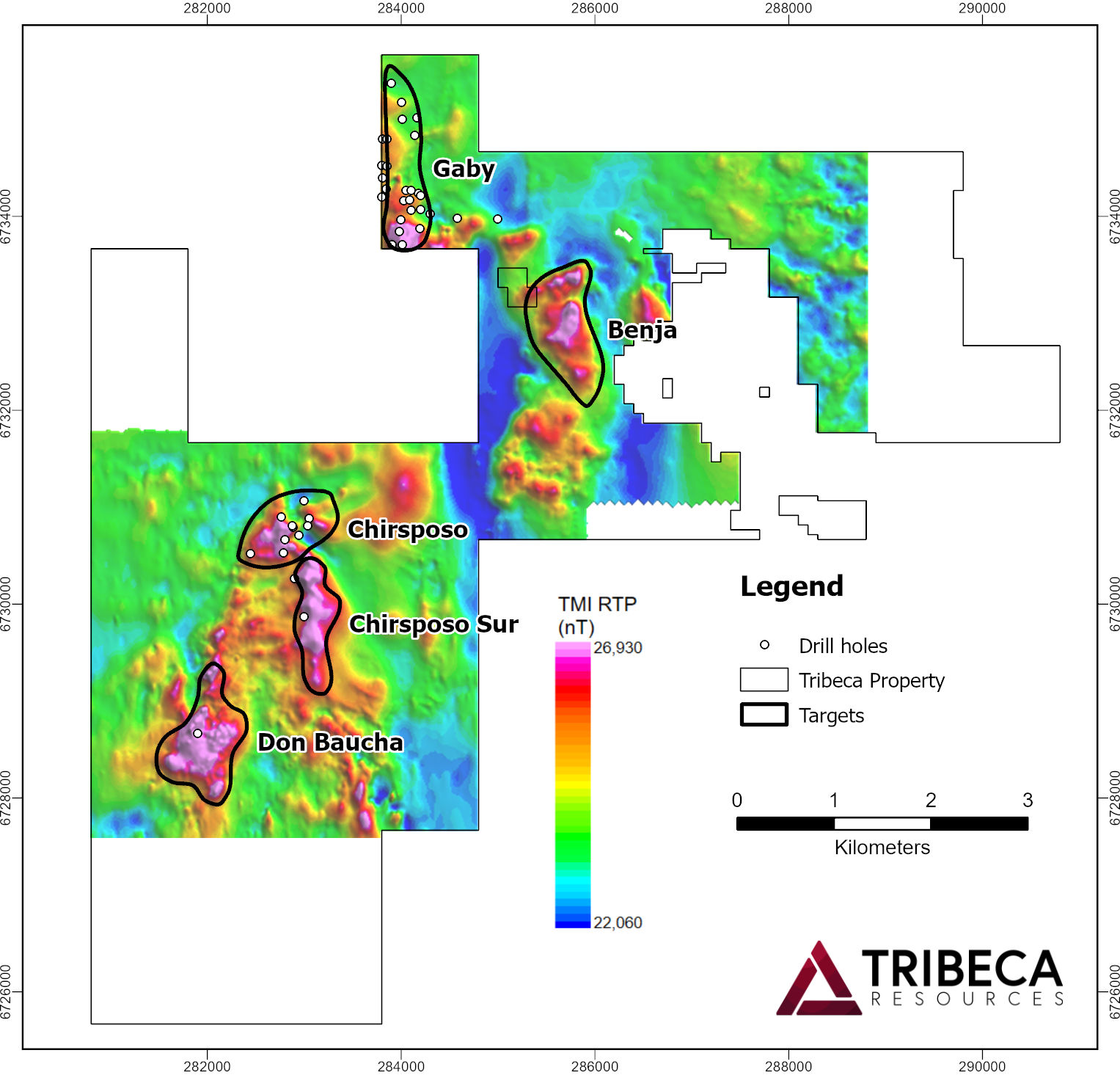 La cartografía geológica preexistente, la geoquímica de suelos y rocas, el levantamiento IP y datos históricos limitados de perforación delinean varios objetivos de perforación, con objetivos adicionales en etapas anteriores en otras partes de la propiedad que aún quedan por detallar con el trabajo de campo adicional que se está realizando. Más información sobre la propiedad está disponible en el comunicado de prensa de Tribeca Resources fechado el 19 de junio de 2025.
