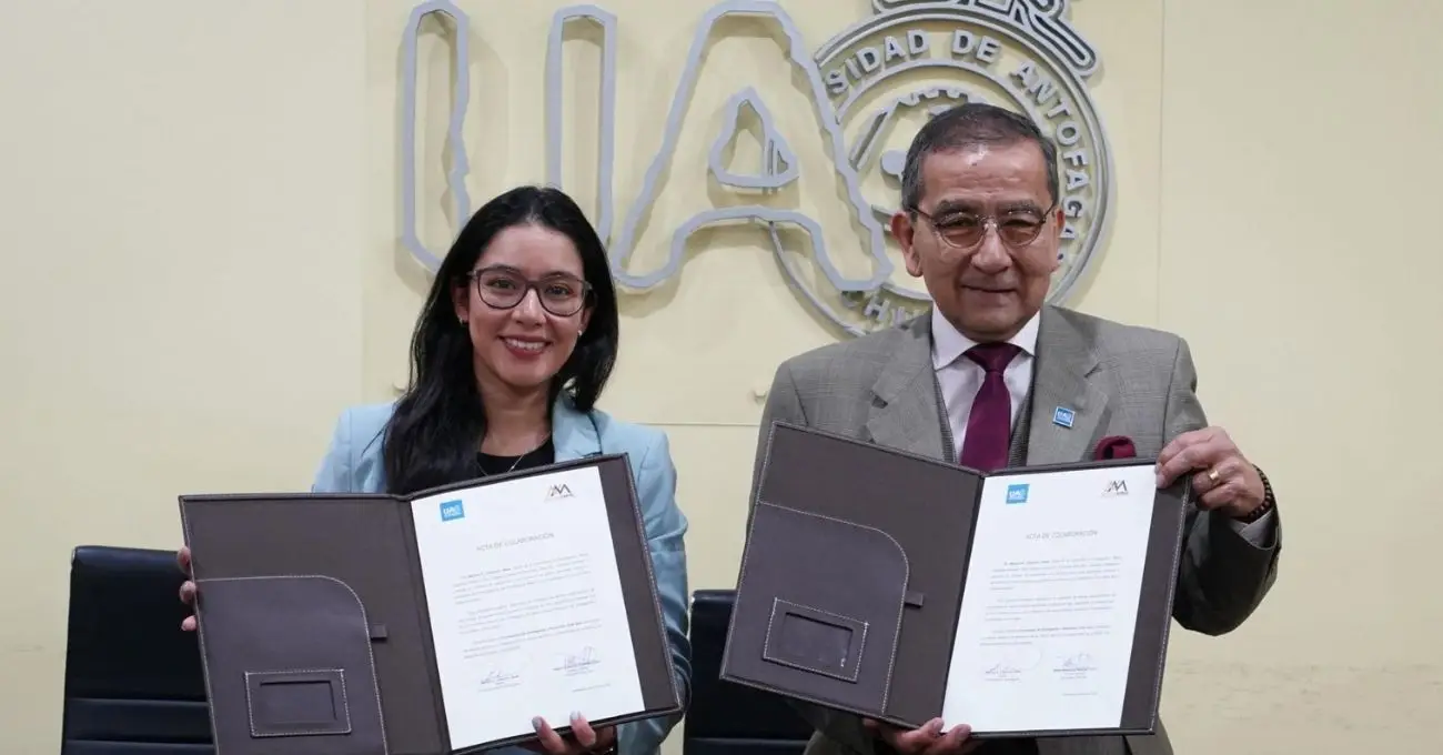 En una ceremonia efectuada en el Campus Angamos del plantel estatal, el rector Dr. Marcos Cikutovic Salas, junto a la fundadora y gerenta general de Novamine María Alejandra Giménez Uribe, formalizaron una alianza estratégica mediante la firma de un nuevo convenio. Con un enfoque intersectorial, el acuerdo busca fomentar el desarrollo de capital humano avanzado y generar oportunidades laborales para los estudiantes de la UA, especialmente en áreas como mantenimiento, innovación y elaboración de productos industriales.